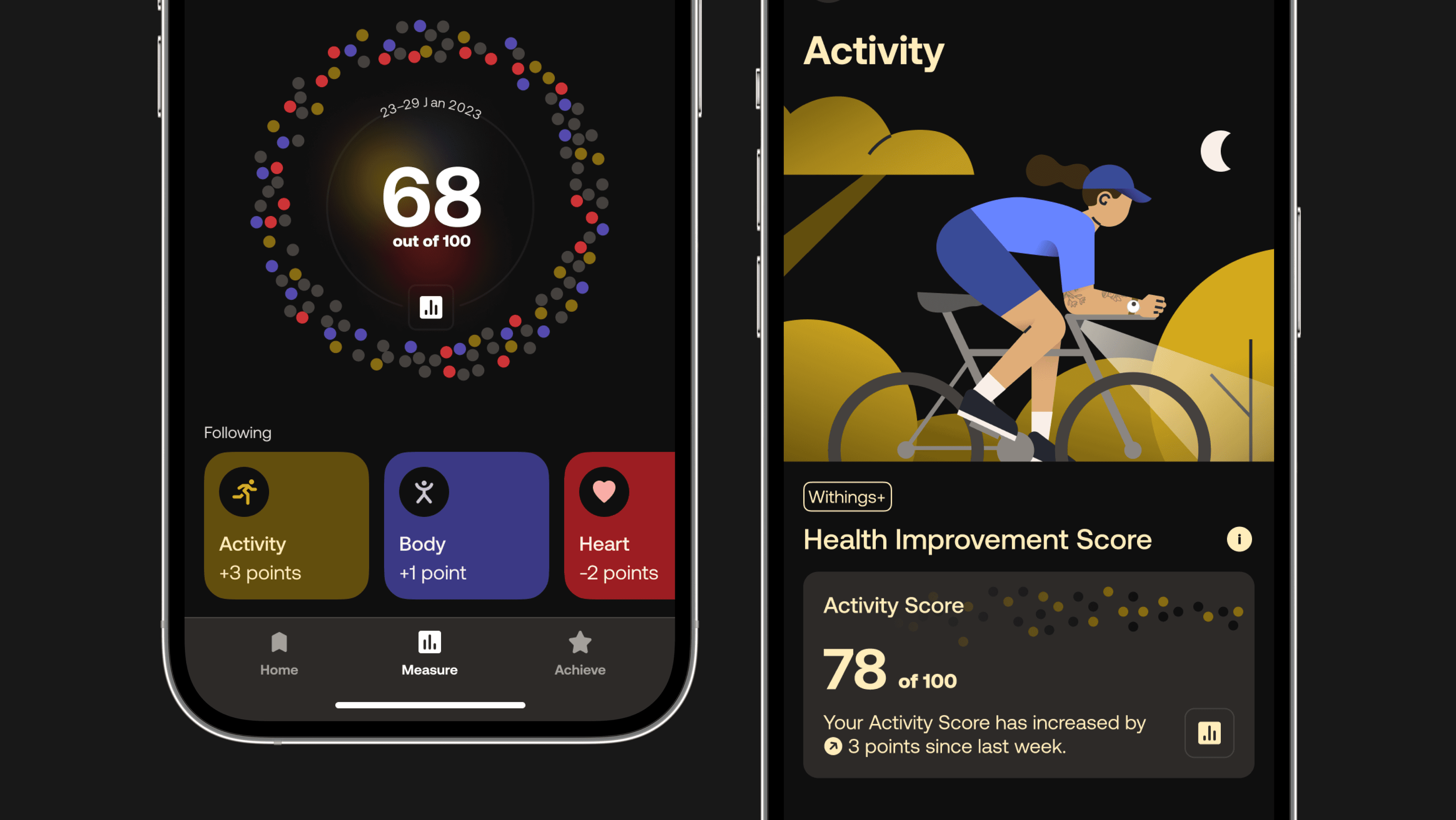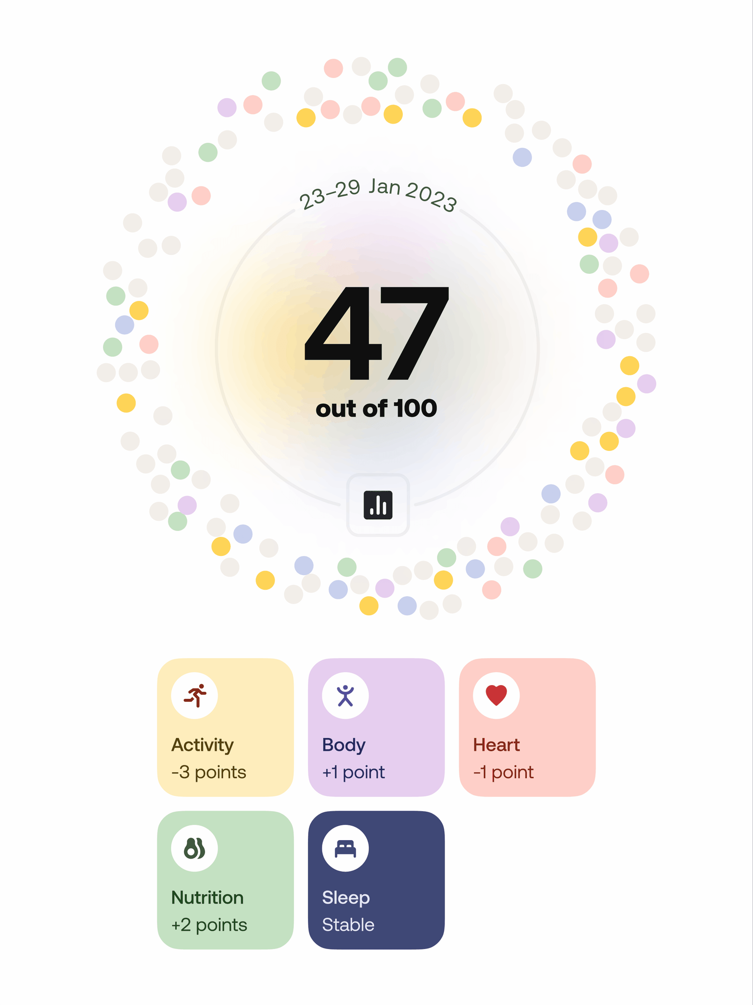 With the score we aimed to enhance the value proposition for Withings+ and attract more subscribers by incorporating a feature that combines measurements so that users can make sense of how they contribute to the big picture. This culminates in the Health Improvement Score, a fully personalized visualization that captures the individual biology of each user. Irrespective of whether the score is high or low, the visualization maintains its allure and warmth, providing users with a secure space to track their health progress and inspiring them to embrace positive changes in the long run.