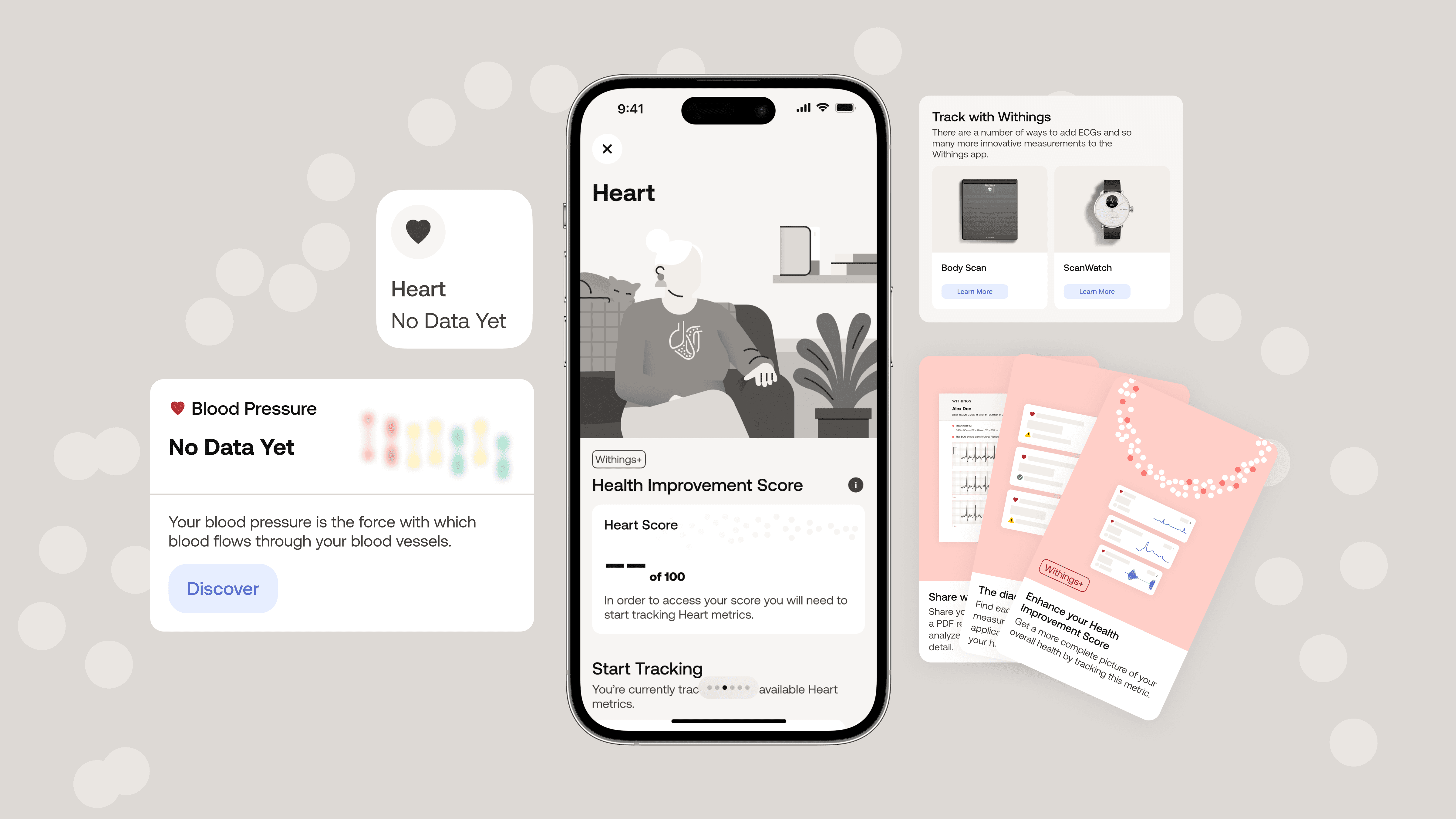 The Measure Tab in the Withings app now includes new start tracking features that promote other Withings devices and educate users about the ecosystem. Previously, there was no cross-selling in the app, resulting in missed health opportunities for users and huge business potential for Withings. These new features emphasise where data is missing by using empty states, greyscale categories, grey particles in the Health Improvement Score and blurred dataviz for missing biomarkers.