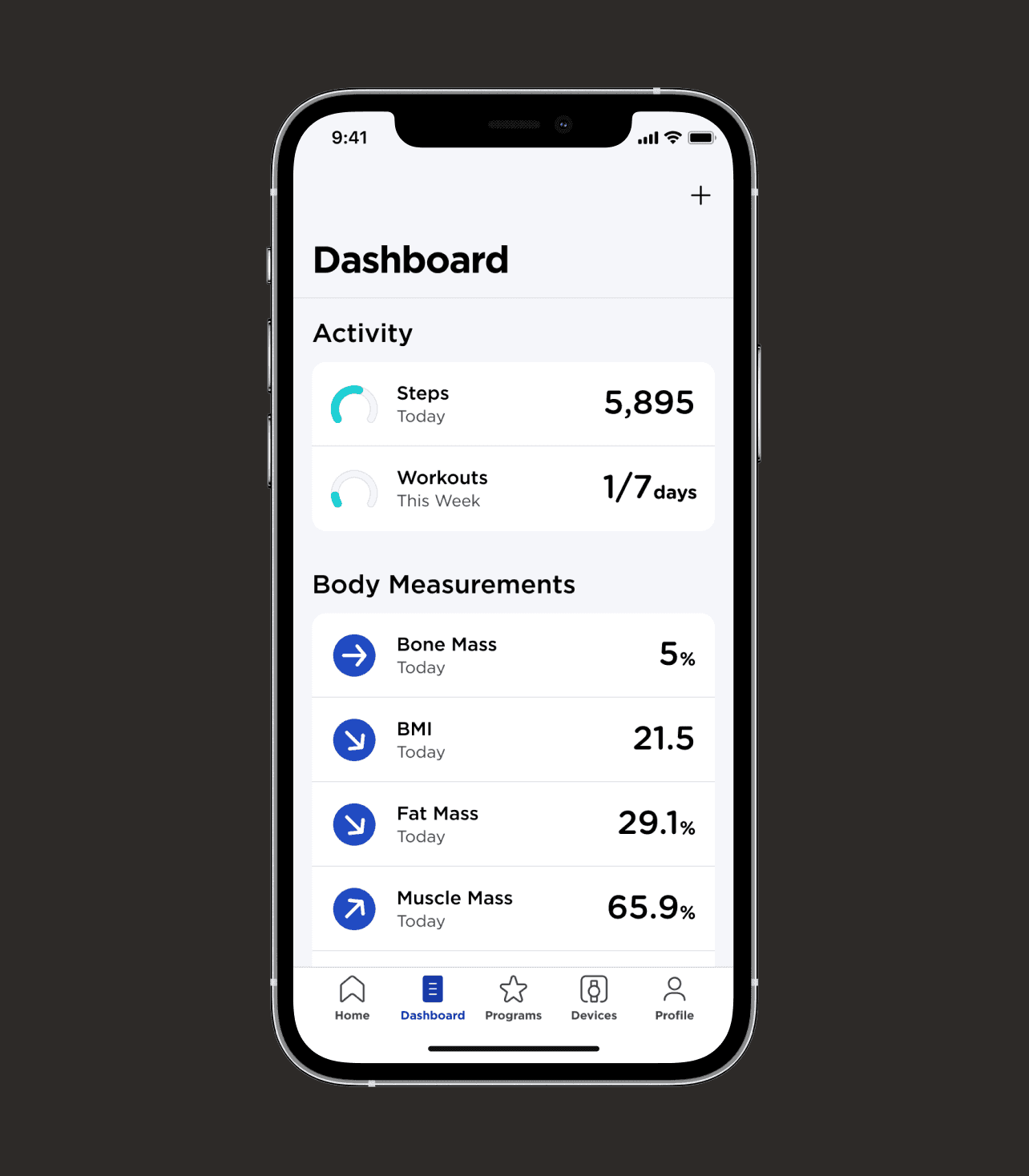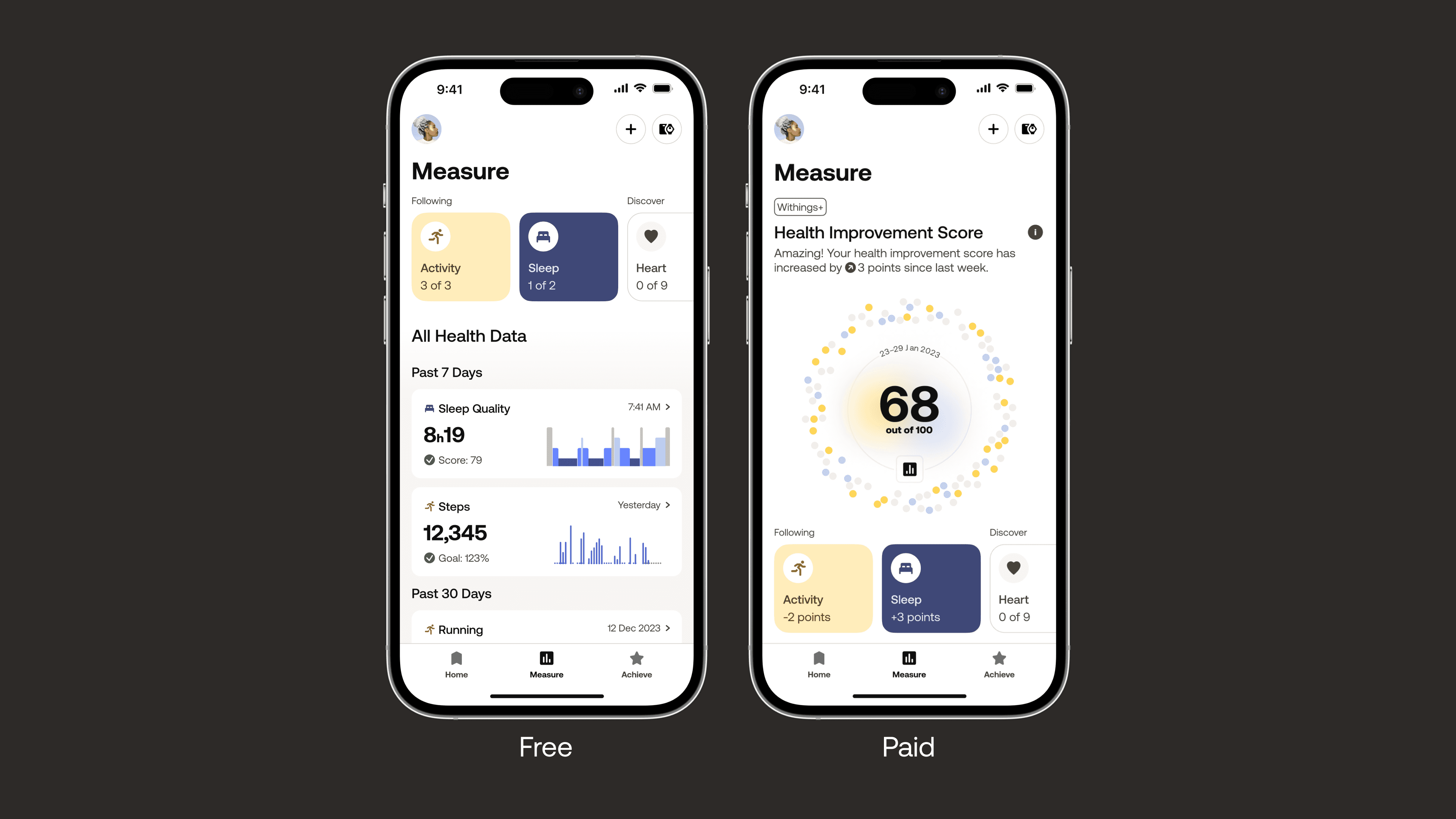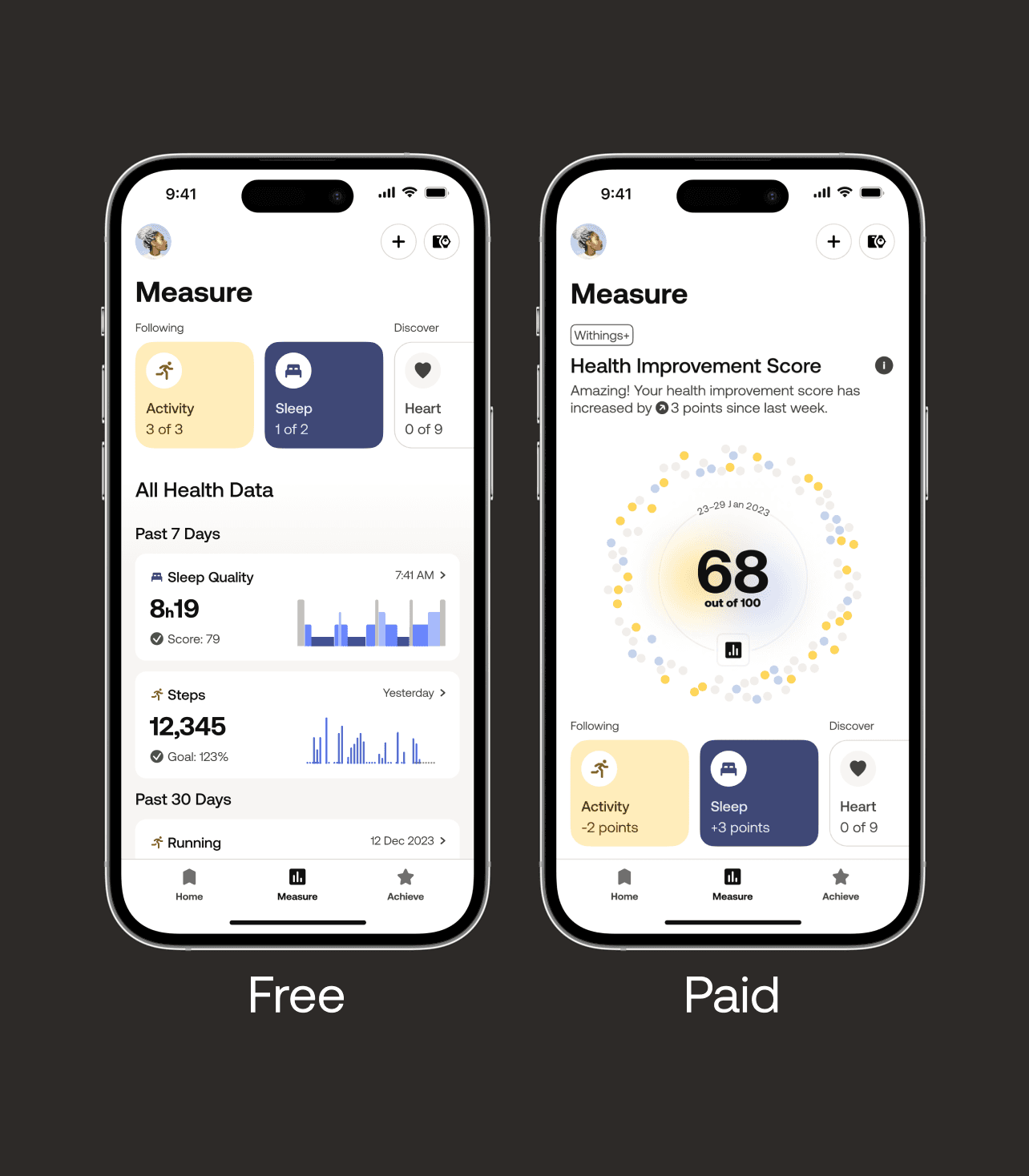 The structure is simple. For Withings+ users they will gain a unique visual piece at the top called the "Health Improvement Score" providing them a snapshot of their global health. There's now also health category navigation that communicates the number of tracked metrics for free users, and score changes for paid users. Users can also explore "All Health Data" based on chronological groupings, reminding them of the metrics or devices they haven't engaged with for a while.